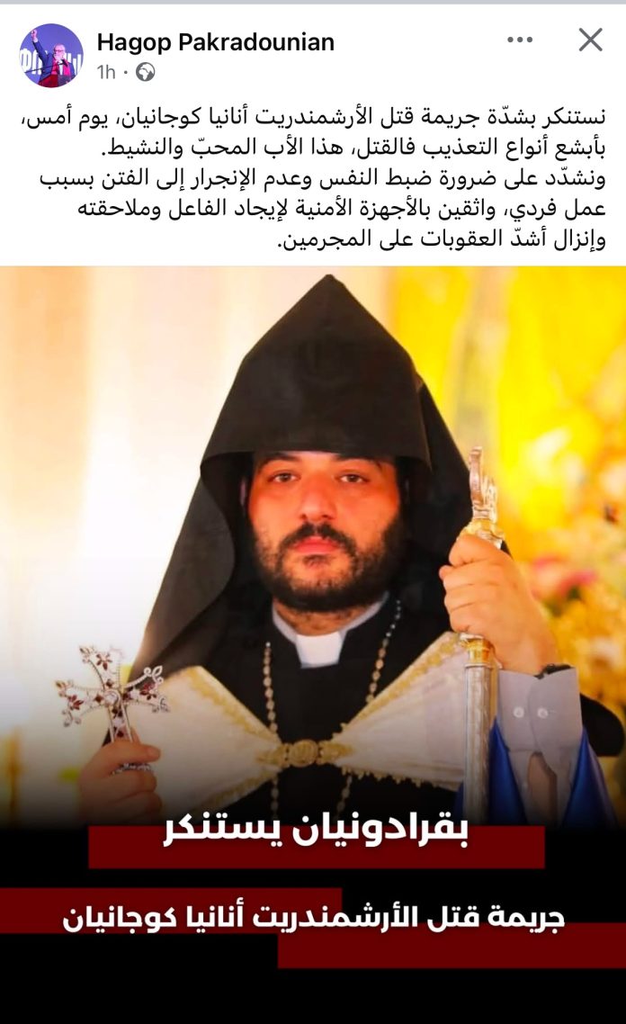 النائب هاغوب بقردونيان نستنكر بشدّة جريمة قتل الأرشمندريت أنانيا كوجانيان، يوم أمس، بأبشع أنواع التعذيب فالقتل، هذا الأب المحبّ والنشيط.