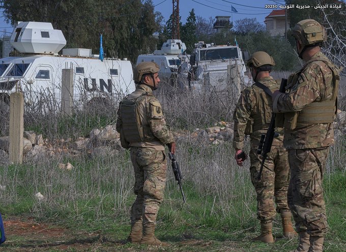 انتشرت وحدات عسكرية في بلدة عيترون – بنت جبيل في القطاع الأوسط ومناطق حدودية أخرى في منطقة جنوب الليطاني بالتنسيق مع اللجنة الخماسية للإشراف على اتفاق وقف إطلاق النار (Mechanism)، وسط تمادي العدو الإسرائيلي في اعتداءاته بما فيها حرق المنازل في عدة بلدات منها عيترون – بنت جبيل ورب ثلاثين والعديسة – مرجعيون، إلى جانب غارتَين على آليات كانت تشارك في عملية انتشال جثامين الشهداء في بلدة الطيبة – مرجعيون. وفي ظل هذه الاعتداءات، تدعو قيادة الجيش المواطنين إلى الالتزام بالتوجيهات الصادرة في بياناتها الرسمية، والتقيد بإرشادات الوحدات العسكرية المنتشرة، والتنسيق مع السلطات المحلية، حفاظًا على أرواحهم وسلامتهم.