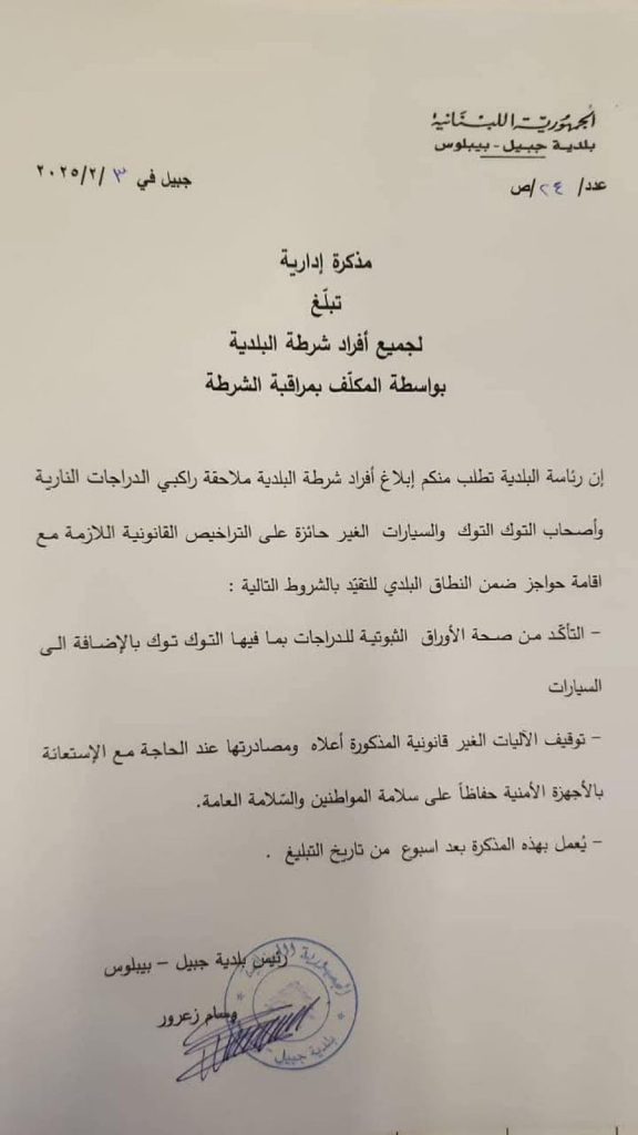 اخبار محليةعلى مدار الساعة مذكرة ادارية بملاحقة الدراجات النارية المخالفة للقوانين في جبيل فبراير 3, 2025 0 119 FacebookTwitterWhatsApp أصدرت بلدية جبيل مذكرة إدارية تطلب فيها من المواطنين إبلاغ شرطة البلدية ملاحقة راكبي الدراجات النارية وأصحاب التوك توك والسيارات الغير حائزة على التراخيص القانونية مع إقامة حواجز في المنطقة على أن يعمل بهذه المذكرة بعد أسبوع