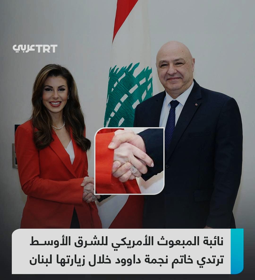 انتشرت عبر منصات التواصل الاجتماعي صورة لنائبة المبعوث الأمريكي إلى الشرق الأوسط، مورغان أورتاغوس، وهي ترتدي خاتماً يحمل نجمة داوود، خلال لقائها الرئيس اللبناني جوزيف عون، مساء الجمعة، في قصر بعبدا الرئاسي شرقي بيروت.