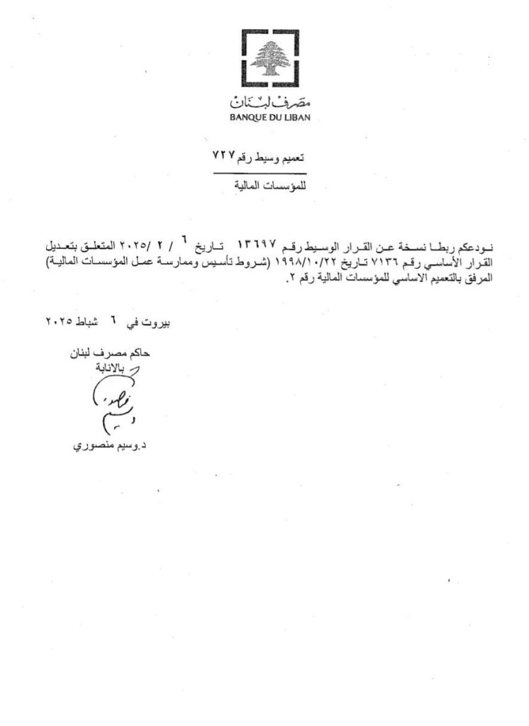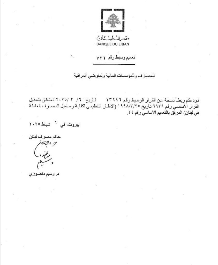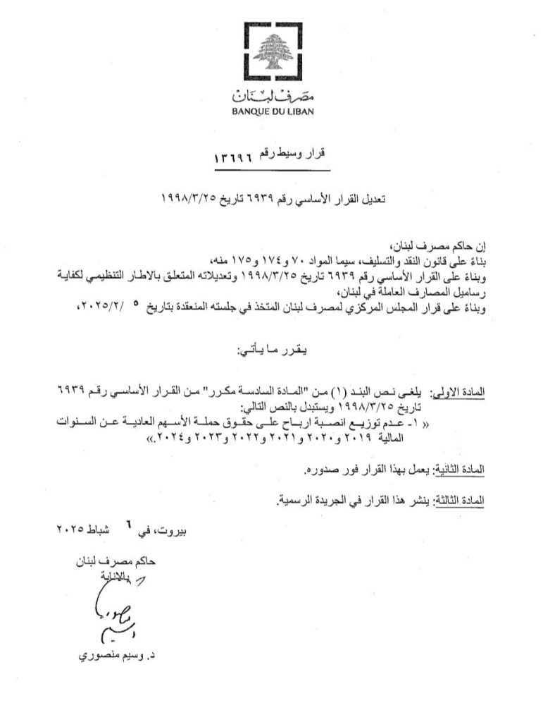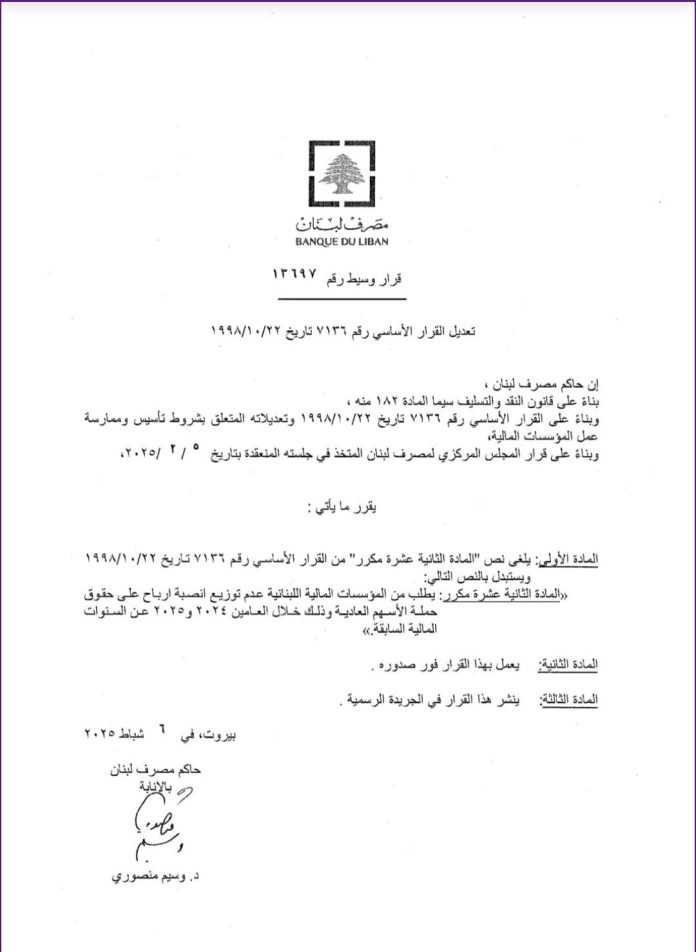 اخبار محليةاخبار مهمةعلى مدار الساعة *بالصور :تعميم أصدره حاكم مصرف لبنان بالإنابة وسيم منصوري للمصارف، وتعميماً ثانياً للمؤسسات المالية، منع بموجبهما توزيع أنصبة أرباح عن السنوات من 2019 الى اليوم* فبراير 8, 2025 0 183 FacebookTwitterWhatsApp