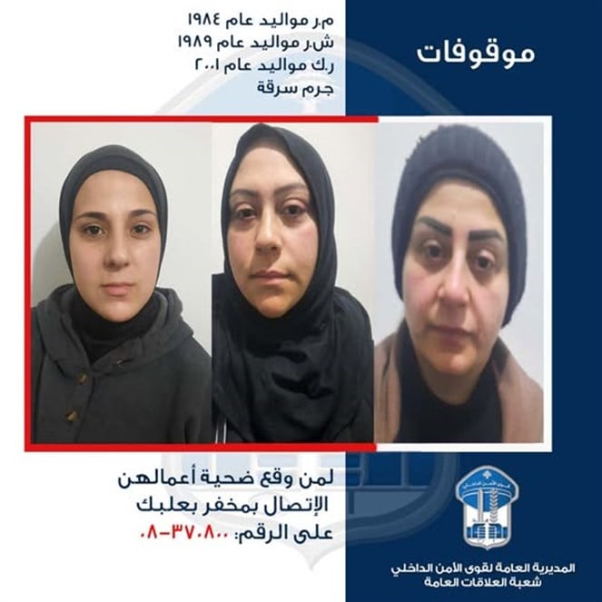 لذلك وبناء على إشارة القضاء المختص، تعمّم المديرية العامة لقوى الأمن الداخلي صور الموقوفات، وتطلب من الذين وقعوا ضحية أعمالهن وتعرفوا اليهن، الحضور الى مخفر بعلبك او الاتصال على رقم الهاتف ٣٧٠٨٠٠-٠٨، تمهيدا لاتخاذ الاجراءات القانونية اللازمة.