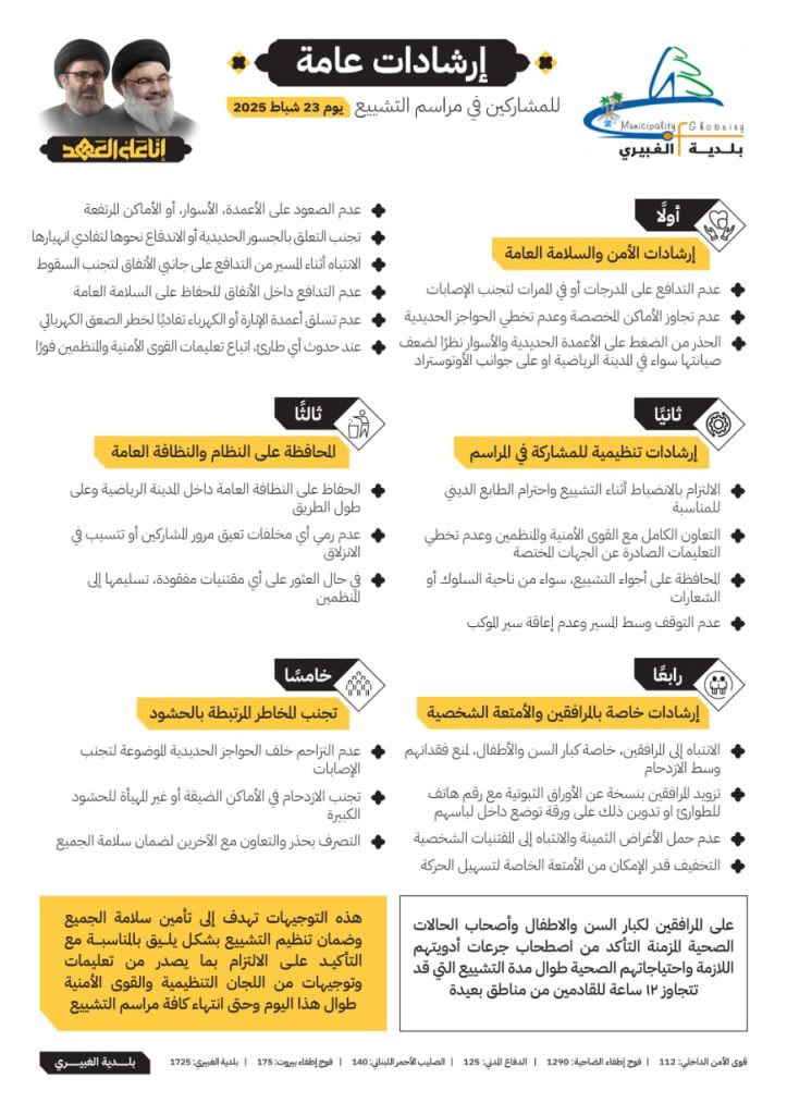 نشرت بلدية الغبيري إرشادات للالتزام بها، حرصاً على سلامة المشاركين في التشييع يوم الأحد.
