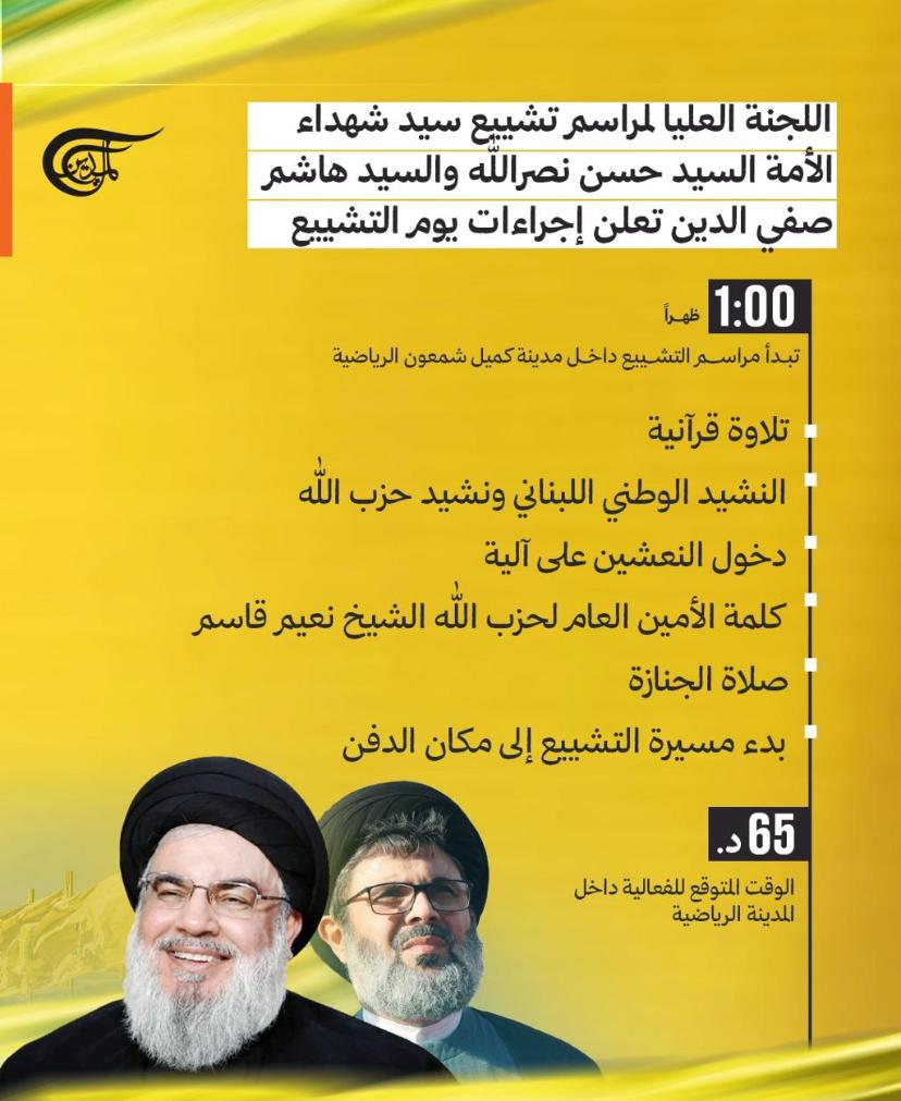 من المتوقّع أن تبدأ مراسم التشييع عند الساعة الواحدة ظهراً بالتوقيت المحلي لمدينة بيروت، على أن يستمر التشييع نحو 65 دقيقة، ثم سيكون دخول النعشين على آلية خاصة وسيكون بعدها كلمة للأمين العام لـ”حزب الله” الشيخ نعيم قاسم، ثم صلاة الجنازة، ومن ثم بدء مسيرة التشييع إلى مكان المدفن على طريق مطار بيروت، على أن يكون التجمع الرئيسي داخل مدينة الرئيس كَميل شمعون الرياضية”.