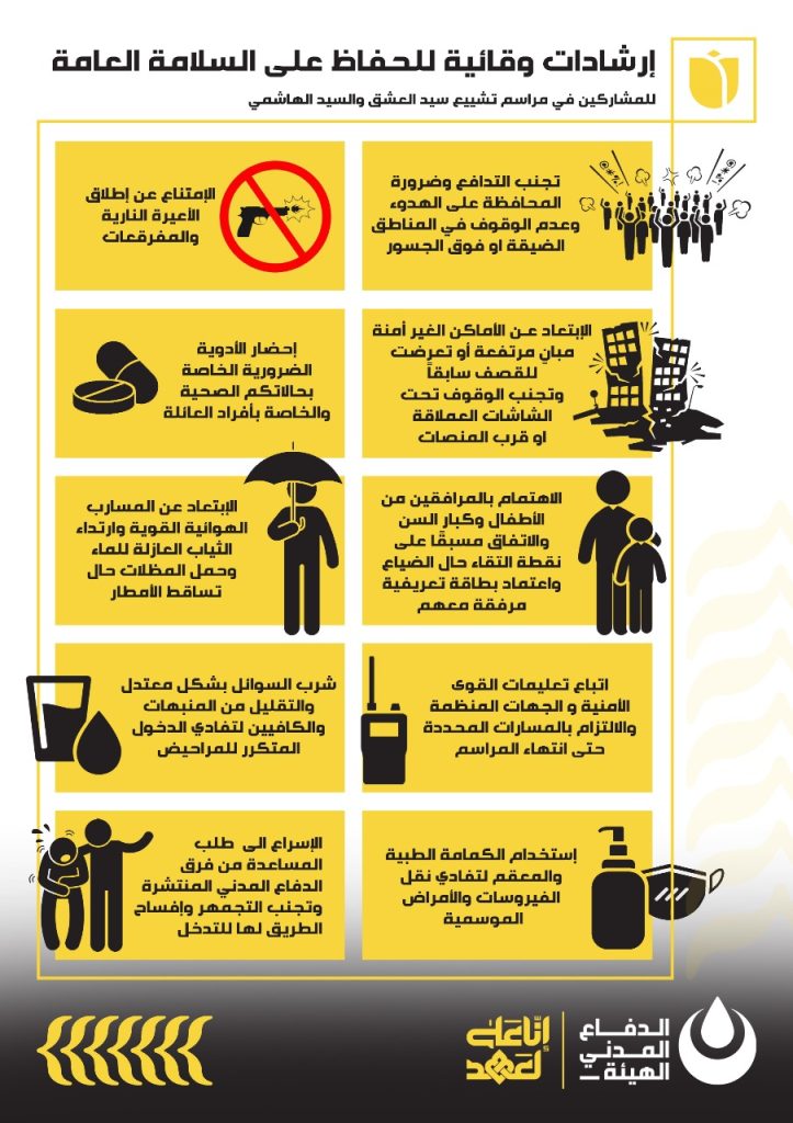 ونشرت الهيئة الصحية مجموعة إرشادات وقائية للحفاظ على السلامة العامة إبان المشاركة في مراسم التشييع:
