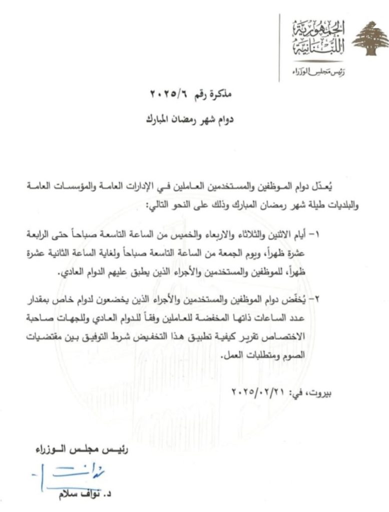 اخبار محليةعلى مدار الساعة *أصدر رئيس مجلس الوزراء نواف سلام مذكرة إدارية تتعلق بدوام شهر رمضان المبارك(مرفقه بالصورة)* فبراير 21, 2025 0 162 FacebookTwitterWhatsApp
