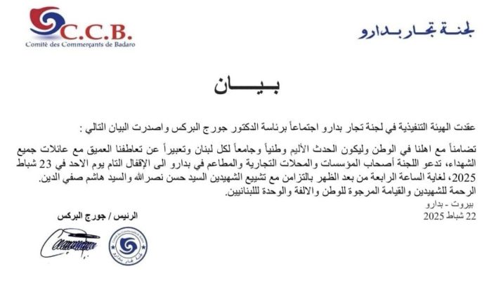 تضامناً مع اهلنا في الوطن وليكون الحدث الأليم وطنياً وجامعاً لكل لبنان وتعبيراً عن تعاطفنا العميق مع عائلات جميع الشهداء، تدعو اللجنة أصحاب المؤسسات والمحلات التجارية والمطاعم في بدارو الى الإقفال التام يوم الاحد في 23 شباط 2025، لغاية الساعة الرابعة من بعد الظهر بالتزامن مع تشييع الشهيدين السيد حسن نصرالله والسيد هاشم صفي الدين.