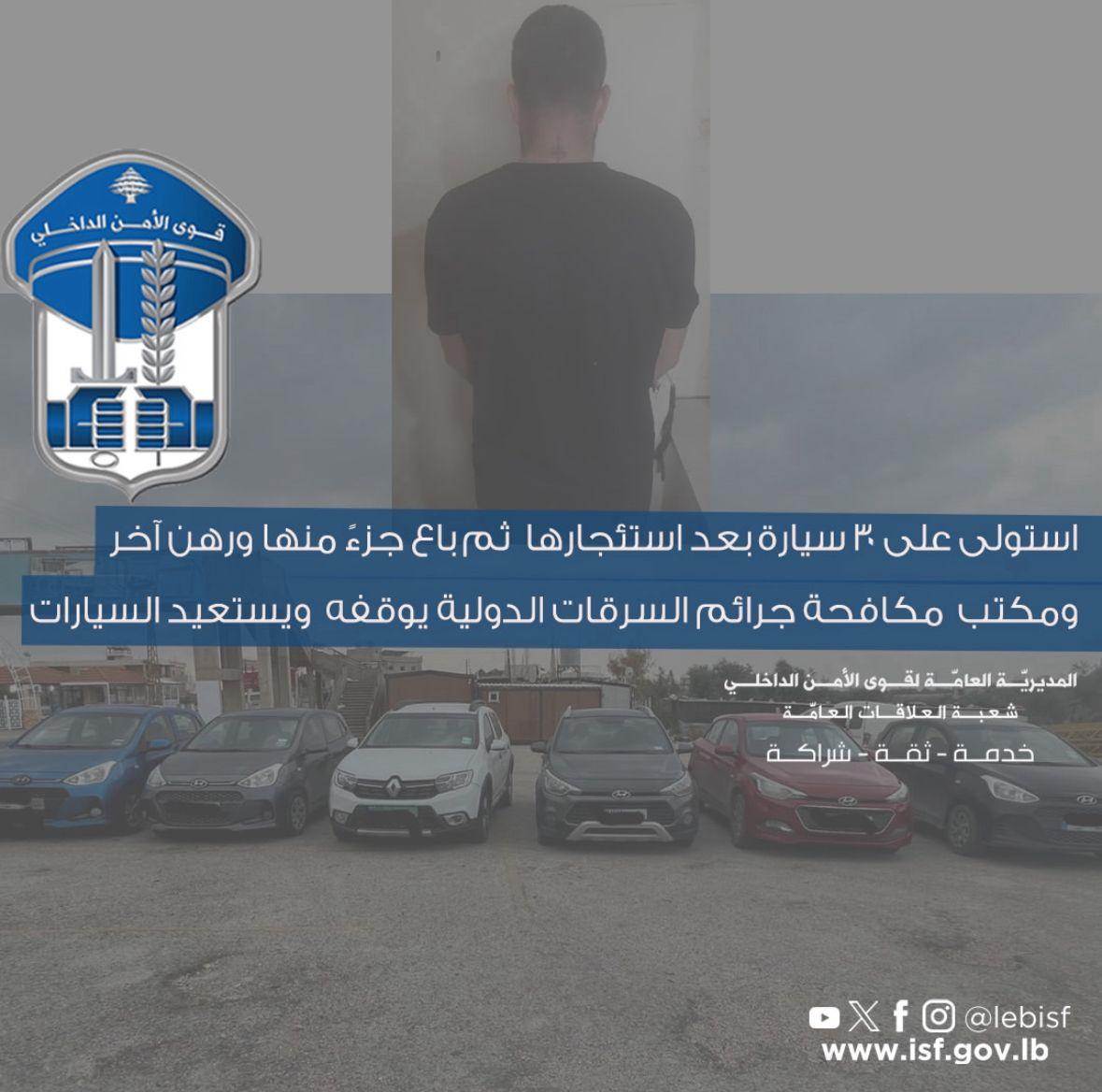” في إطار المتابعة اليومية التي تقوم بها قطعات قوى الأمن الداخلي لملاحقة المطلوبين للقضاء وتوقيفهم، وبعد ورود شكوى إلى مكتب مكافحة جرائم السّرقات الدّوليّة في وحدة الشّرطة القضائيّة من قبل إحدى شركات تأجير السيارات ضد المدعو م. ك. (من مواليد عام 1995، لبناني) مطلوب بجرائم سرقة وإساءة أمانة.