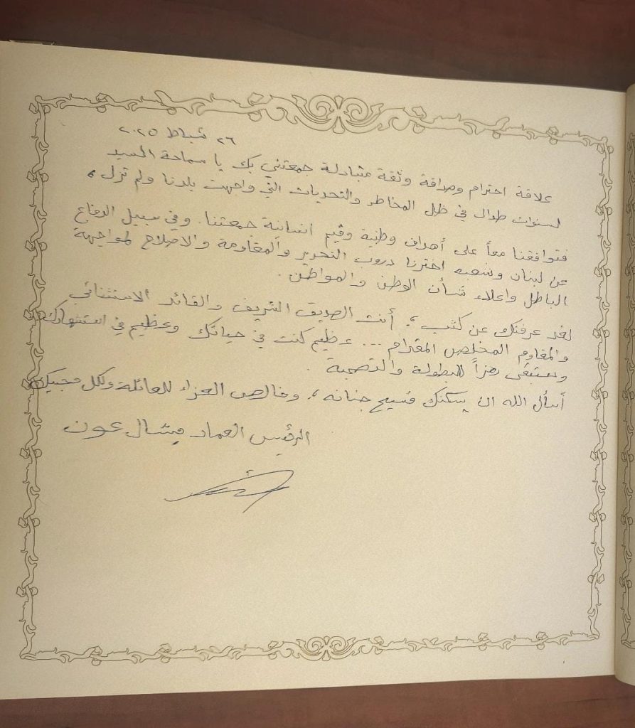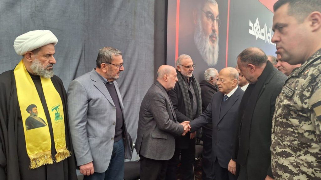 قدّم الرئيس العماد ميشال عون، التعزية بالأمين العام لحزب الله الشهيد السيد حسن نصرالله، وبالشهيد السيد هاشم صفي الدين، في باحة عاشوراء، محلة الجاموس،حيث يتقبّل حزب الله وعائلتا الشهيدين العزاء. وقد دوّن كلمة في سجل التعازي جاء فيها: