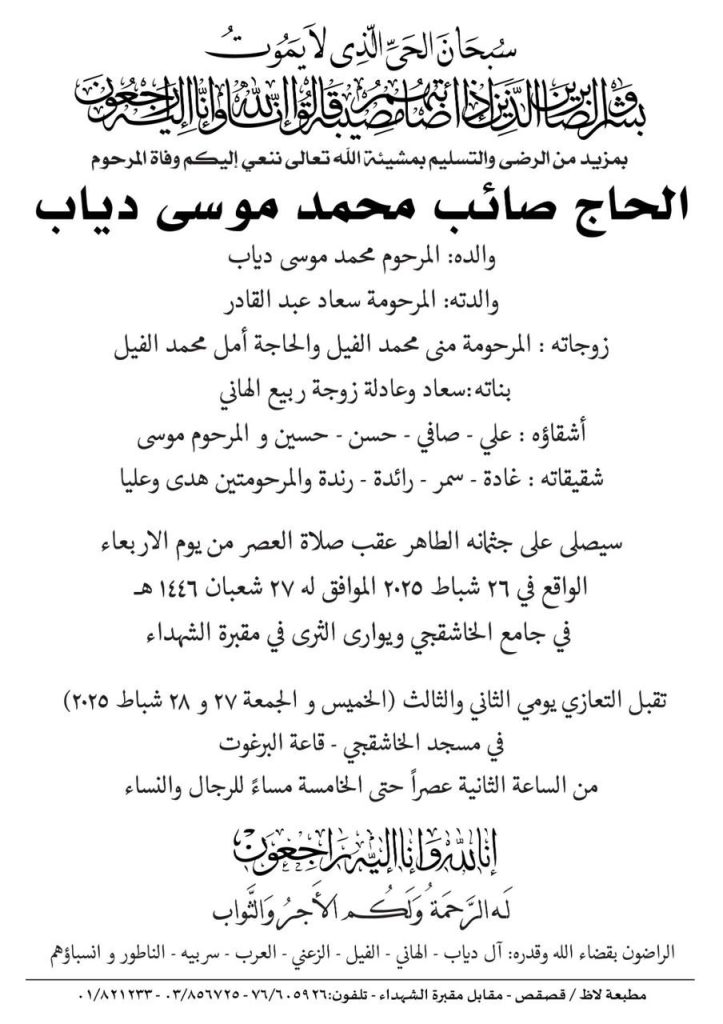 على مدار الساعةمتفرقات وفاة مدير الاخبار السابق لتلفزيون لبنان الاستاذ صائب دياب فبراير 26, 2025 0 108 FacebookTwitterWhatsApp غيب الموت المدير السابق لتلفزيون لبنان الاستاذ صائب دياب بعد صراع مع المرض