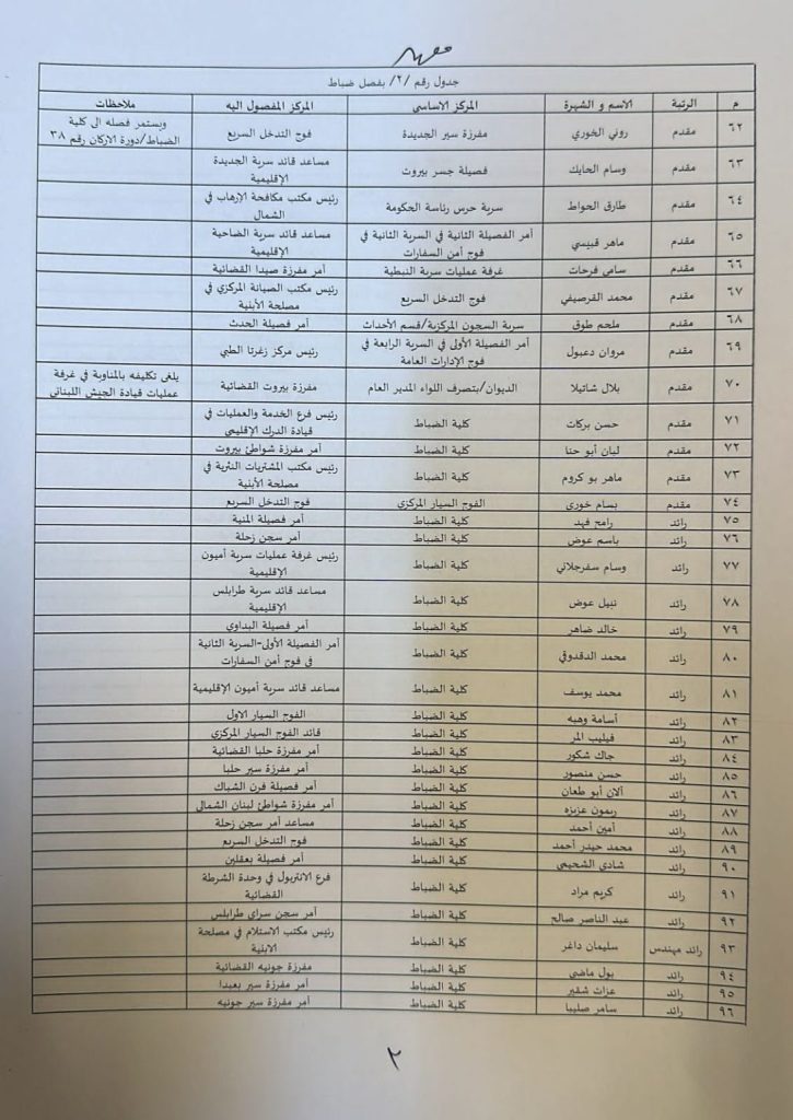 وشملت التشكيلات 127 ضابطاً من رتبة ملازم أول ولغاية رتبة عميد، حيث ضمت برقيات الفصل 42 عميداً، وعقيداً واحداً، و31 مقدّماً، و27 رائداً، و23 نقيباً، و3 ملازم أول.