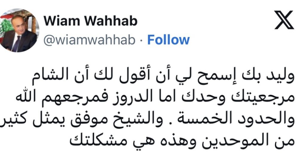 كتب رئيس حزب التوحيد العربي وئام وهاب عبر حسابه على “اكس”: “وليد بك إسمح لي أن أقول لك أن الشام مرجعيتك وحدك اما الدروز فمرجعهم الله والحدود الخمسة . والشيخ موفق يمثل كثير من الموحدين وهذه هي مشكلتك”. وكان رئيس الحزب التقدمي الإشتراكي السابق وليد جنبلاط قد قال إن “الشيخ موفّق طريف لا يمثّلنا وسأذهب إلى دمشق لتأكيد مرجعيّة الشام ويريدون جرّ بعض ضعفاء النفوس الى حرب أهلية لا أدري كيف ستنتهي”.