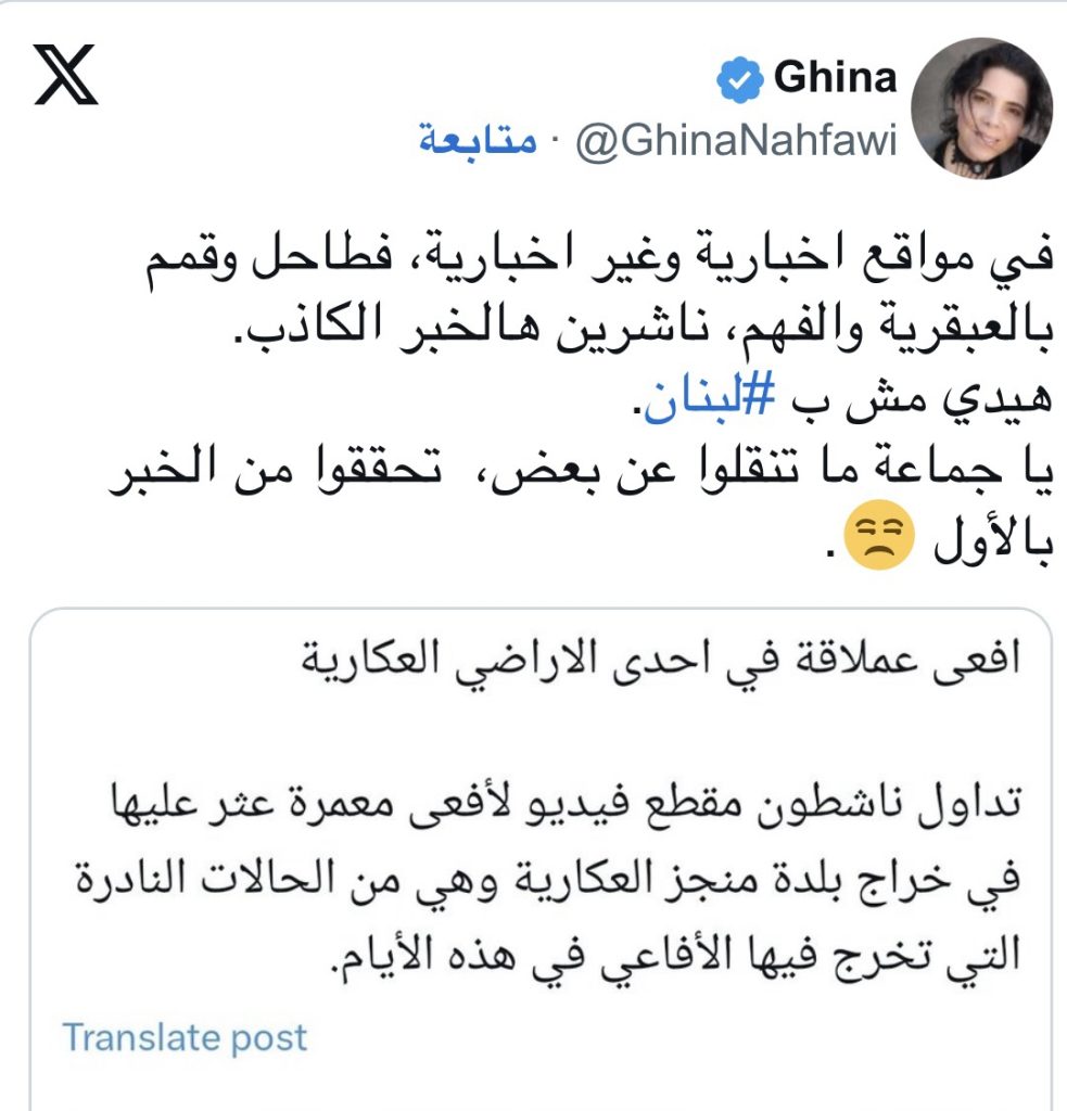 اخبار محليةعلى مدار الساعة *ما حقيقة العثور على أفعى عملاقة في لبنان؟* مارس 5, 2025 0 196 FacebookTwitterWhatsApp تداول رواد مواقع التواصل الإجتماعيّ فيديو، لأفعى كبيرة جدّاً، زعم ناشروه أنّه التُقِطَ في عكار. وفي هذا السياق، أوضحت المدافعة عن حقوق الإنسان غنوى نحفاوي، أنّ الخبر غير صحيح، والفيديو لم يُلتقط في لبنان. وقالت: “هيدي مش بلبنان”.