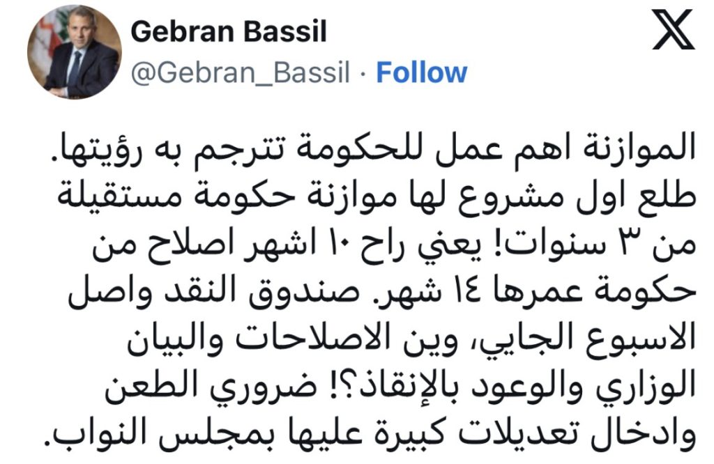 كتب رئيس التيار الوطني الحر، النائب جبران باسيل، اليوم الجمعة، في منشورٍ على حسابه عبر منصة ‘إكس’: ‘الموازنة هي أهم عمل تقوم به الحكومة، حيث تترجم من خلالها رؤيتها’.