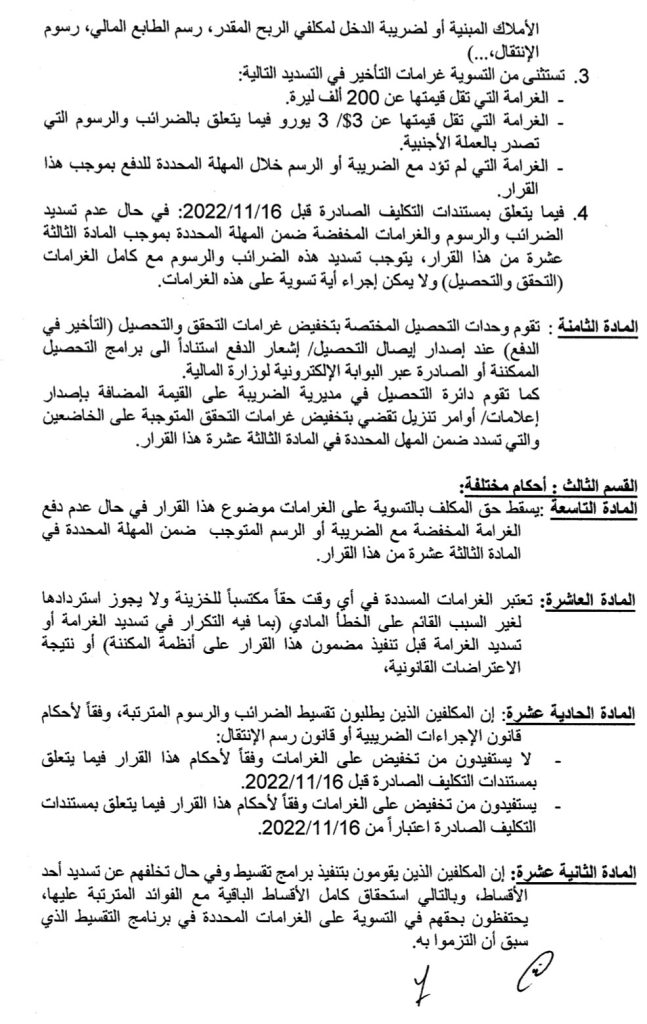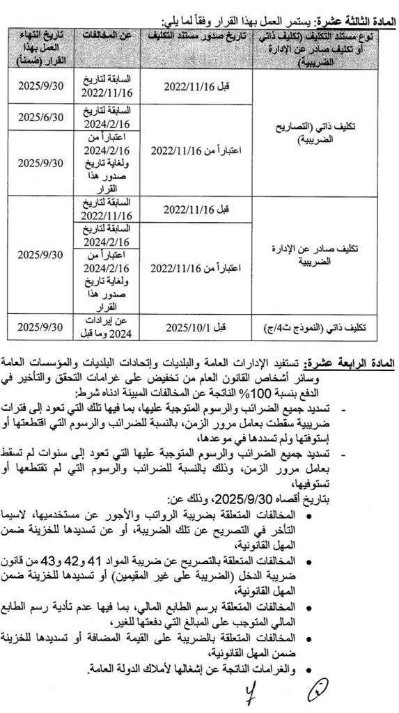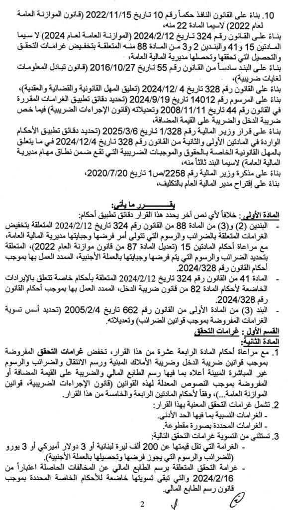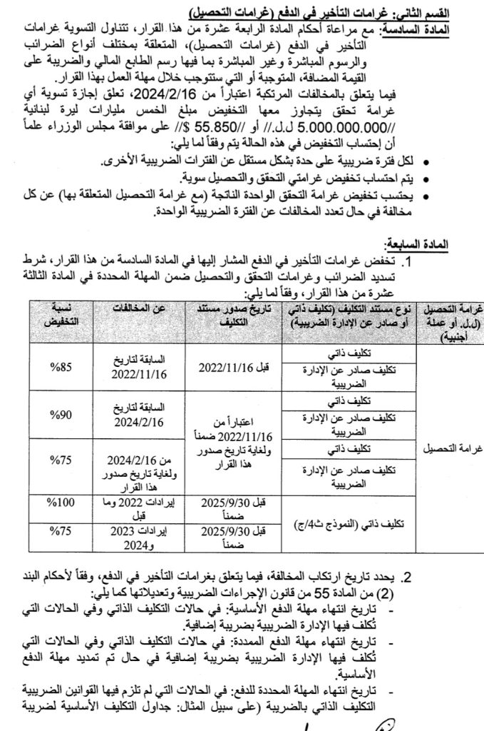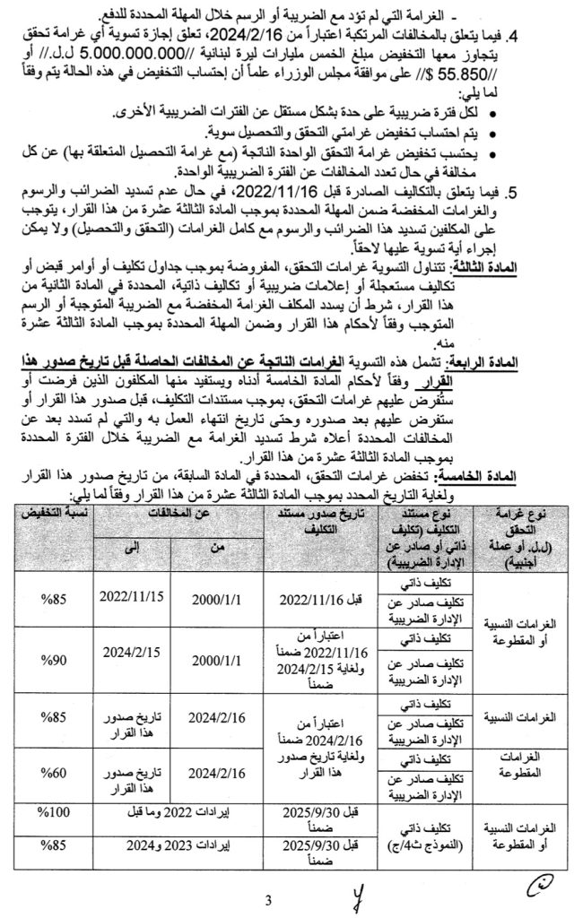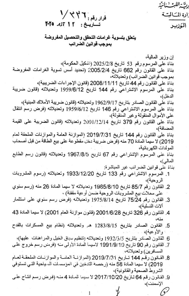 أصدر وزير المال ياسين جابر قراراً حمل الرقم 336/1 تاريخ 12/3/2025، يتعلق بتسوية غرامات التحقق والتحصيل المفروضة بموجب قوانين الضرائب وقضى بتخفيض الغرامات بنسب متفاوتة تصل الى 75% وبعضها الى 100% خصوصاً للإدارات العامة والمؤسسات العامة والبلديات، وحدّد لكل منها مهلة زمنية ينتهي العمل بآخرها بتاريخ 30/9/2025.