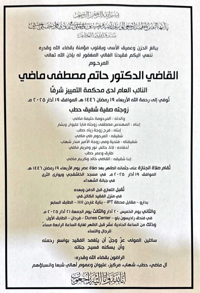 اخبار محليةعلى مدار الساعة بالصورة مدعي عام سابق في ذمة الله مارس 19, 2025 0 127 FacebookTwitterWhatsApp توفي مدعي عام التمييز السابق القاضي حاتم ماضي، اليوم، 19 آذار، بعد مسيرة حافلة في مجال القضاء.