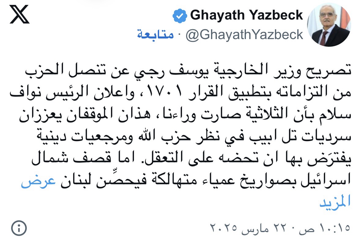 أشار النائب غياث يزبك الى أن “تصريح وزير الخارجية يوسف رجي عن تنصل الحزب من التزاماته بتطبيق القرار ١٧٠١ واعلان الرئيس نواف سلام بأن الثلاثية صارت وراءنا، هذان الموقفان يعززان سرديات تل ابيب في نظر حزب الله ومرجعيات دينية يفترَض بها ان تحضه على التعقل”.