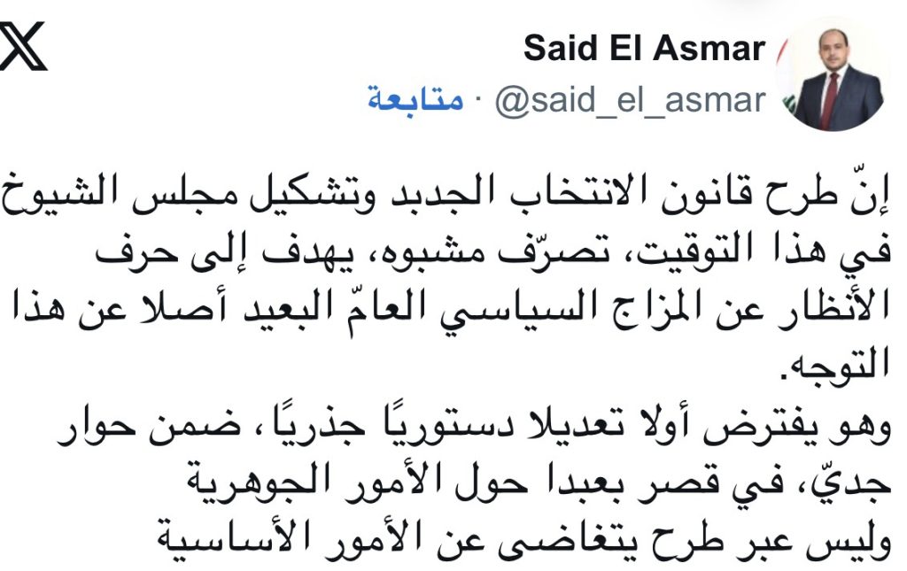 أشار عضو تكتل الجمهورية القوية النائب سعيد الأسمر، اليوم الإثنين، إلى أن “طرح قانون الانتخاب الجديد وتشكيل مجلس الشيوخ في هذا التوقيت، تصرّف مشبوه، يهدف إلى حرف الأنظار عن المزاج السياسي العامّ البعيد أصلاً من هذا التوجه”.