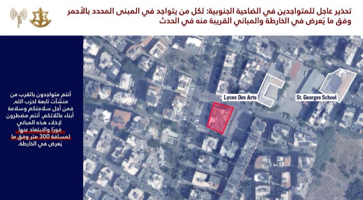 🔸لكل من يتواجد في المبنى المحدد بالأحمر وفق ما يُعرض في الخارطة والمباني المجاورة له: أنتم تتواجدون بالقرب من منشآت تابعة لحزب الله