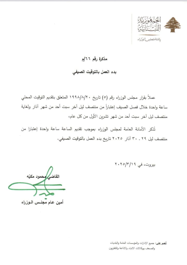 عملاً بقرار مجلس الوزراء المُتعلّق بتقديم التوقيت المحلّي، ساعة واحدة خلال فصل الصيف اعتباراً من منتصف ليل آخر سبت أحد من آذار، ولغاية منتصف ليل آخر سبت أحد من تشرين الأول من كلّ عام، ذكّر أمين عام مجلس الوزراء بوجوب “تقديم السّاعة ساعة واحدة اعتباراً من منتصف ليل 28-29 آذار 2020 تاريخ بدء العمل بالتوقيت الصيفي”.