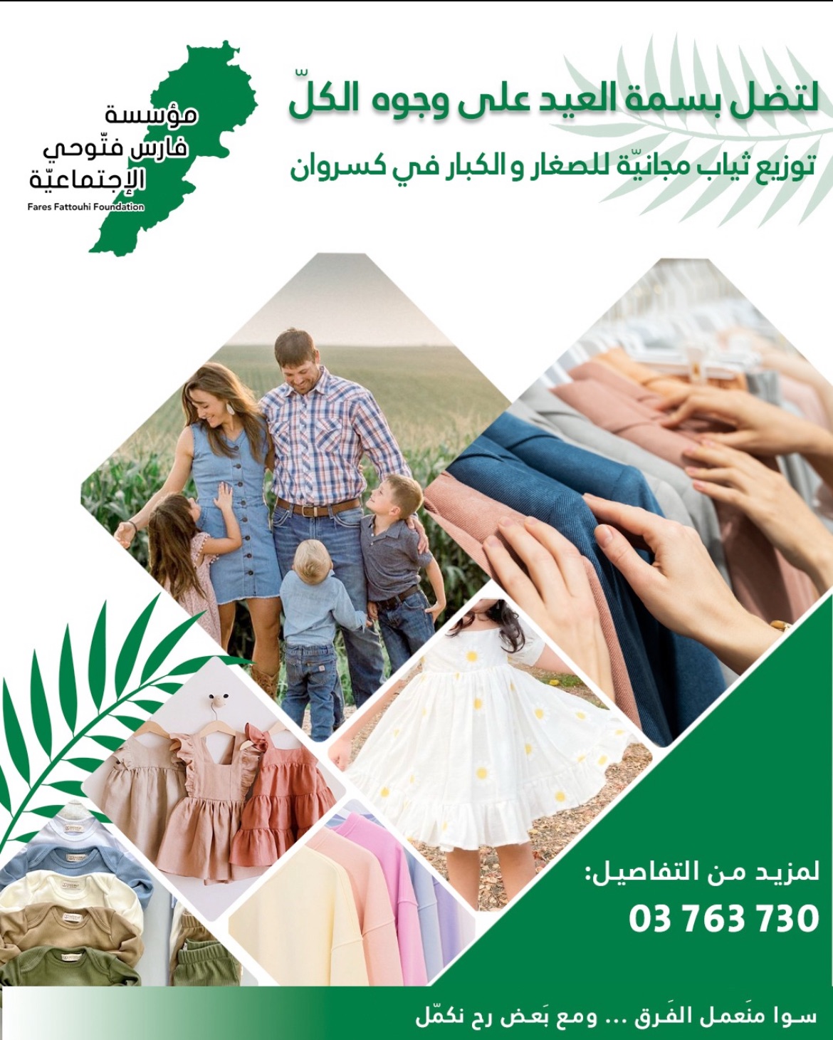 بمناسبة الأعياد المجيدة، تستكمل مؤسسة فارس فتّوحي الاجتماعية حملتها الخيرية لتوزيع الثياب المجانية للصغار والكبار في منطقة كسروان، تأكيدًا على رسالتها في دعم العائلات وتخفيف الأعباء في هذه الفترة المباركة.