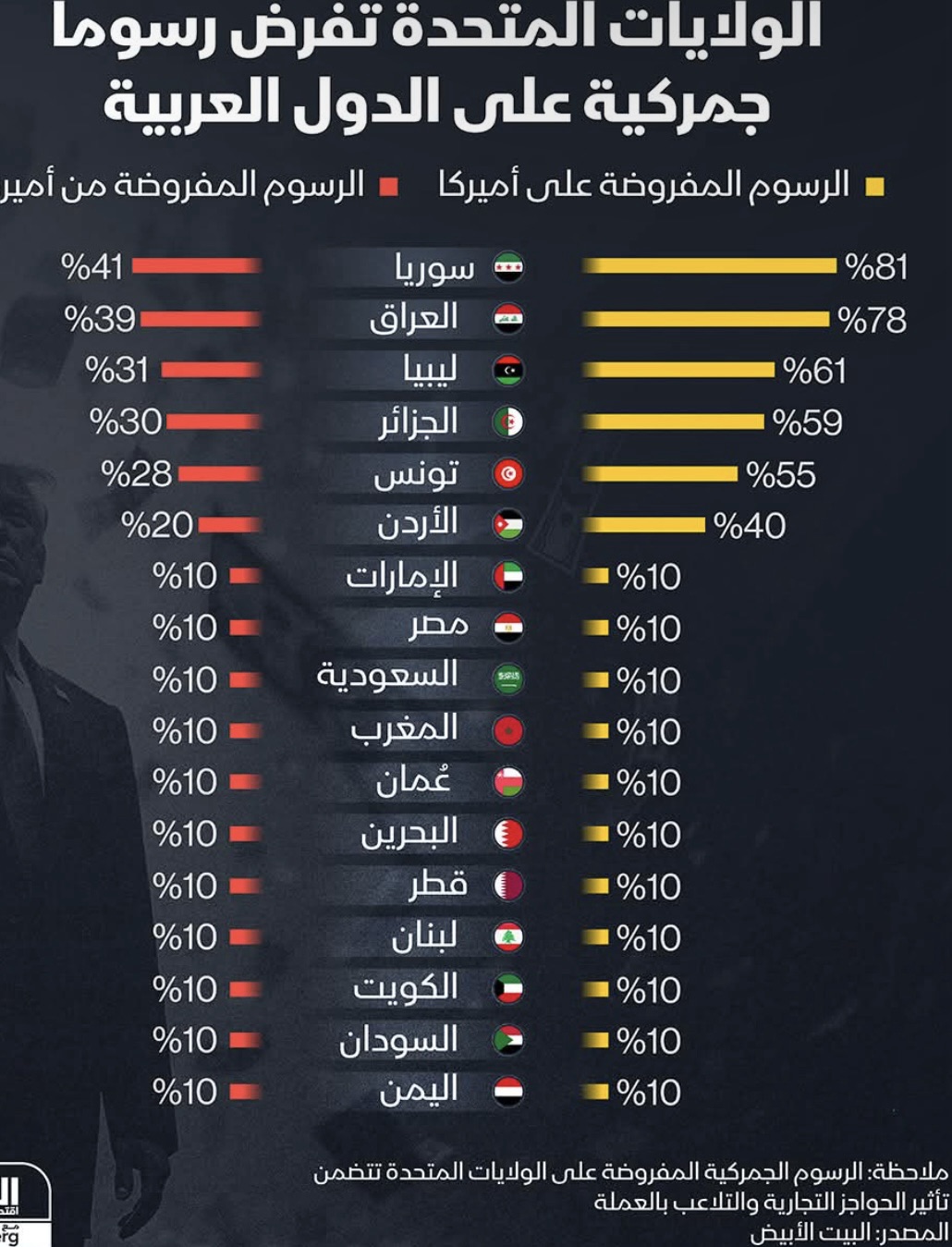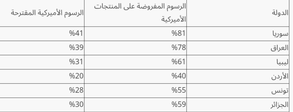 تم فرض الحد الأدنى من الرسوم المتبادلة على غالبية الدول العربية، ولكن ترمب رفع النسبة بشكل كبير على كل من سوريا والعراق وليبيا.