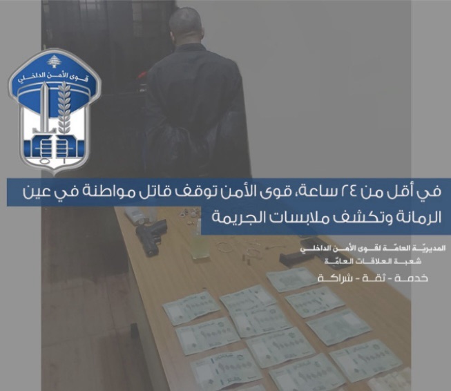 تابع البلاغ:” بناء عليه، وبعد التنسيق بين الفصيلة المذكورة وشعبة المعلومات، تم استدراج القاتل الى محلة جسر الصفير حيث ألقت القوة الخاصة في شعبة المعلومات القبض عليه، وضبطت مسدسًا حربيًا، مبلغ /1,200/$، هاتفًا خلويًا جديدًا وقسمًا من المسروقات.