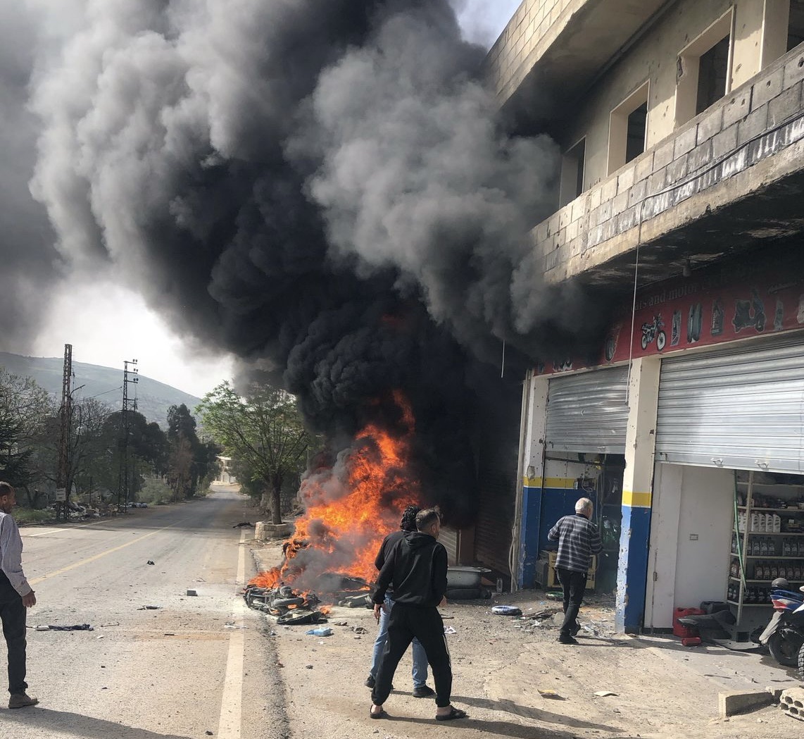 وشنّت مسيّرة غارة على دراجة في بلدة الطيبة، ما أدّى إلى اشتعالها أمام محلّ لتصليح الدراجات النارية.