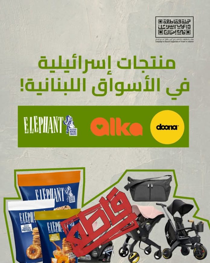 أعلنت حملة مقاطعة “إسرائيل” في لبنان، في بيان،” أن في الأسواق اللبنانية منتجان إسرائيليان الأول هو عربات الأطفال من إنتاج شركة “دونا” Doona ومقرمشات Elephant Snacks من إنتاج شركة “ألكا” Alka.