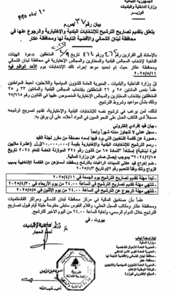 نشرت وزارة الداخلية والبلديات، على منصة “أكس”، بياناً صادراً عن الوزير أحمد الحجار يتعلق بتقديم تصاريح الترشيح للانتخابات البلدية والاختيارية و الرجوع عنها في محافظة لبنان الشمالي والأقضية التابعة لها ومحافظة عكار.