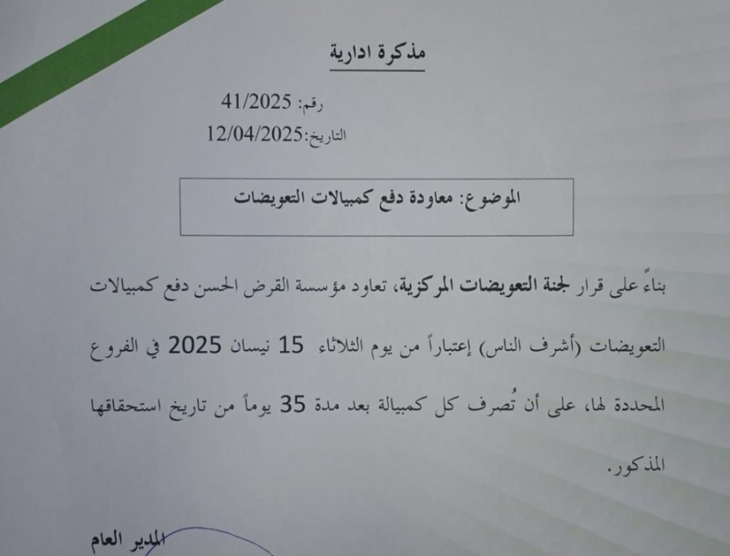 اخبار محليةعلى مدار الساعة *قرض الحسن سيُعاود الدفع.. بهذا التاريخ! (صورة)* أبريل 12, 2025 0 142 FacebookTwitterWhatsApp أصدرت مؤسسة القرض الحسن، مذكرة إدارية، تقضي بمعاودة دفع كمبيالات التعويضات إعتباراً من يوم الثلاثاء 15 نيسان 2025 في الفروع المحددة لها، على أن تُصرف كل كمبيالة بعد مدة 35 يوماً من تاريخ استحقاقها المذكور.