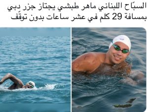 قهر السباح اللبناني البطل ماهر طبشي مسافة 29 كيلومترا في جزر امارة دبي(الامارات العربية المتحدة)، باجتيازه المسافة بوقت قارب العشر ساعات من دون توقف بعد تحضير دام سنتين وتدريبات مكثفة دامت خمسة اشهر وسبقت المغامرة الجديدة والتاريخية والاولى من نوعها التي قام بها طبشي ابن مدينة البترون اللبنانية الساحلية.