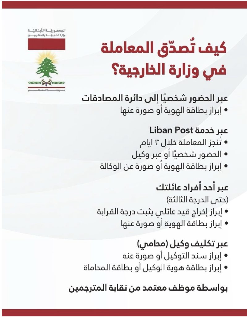 اخبار محليةعلى مدار الساعة *بالصورة – كيف تصدّق المعاملة في “الخارجية”؟* أبريل 16, 2025 0 139 FacebookTwitterWhatsApp نشرت وزارة الخارجية والمغتربين الخطوات اللازمة التي تساعد المواطنين على تصديق معاملاتهم.