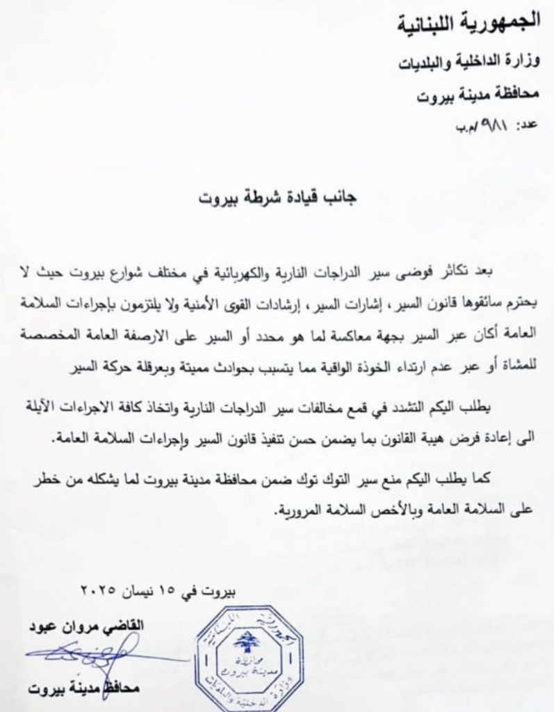وجّه محافظ بيروت القاضي مروان عبود كتابًا إلى قيادة شرطة بيروت في قوى الأمن الداخلي، طالب فيه بالتشدد في ضبط مخالفات الدراجات النارية والكهربائية المنتشرة في شوارع العاصمة، مشيرًا إلى تجاوزات خطيرة أبرزها السير بعكس الاتجاه، استخدام الأرصفة، وعدم ارتداء الخوذة.