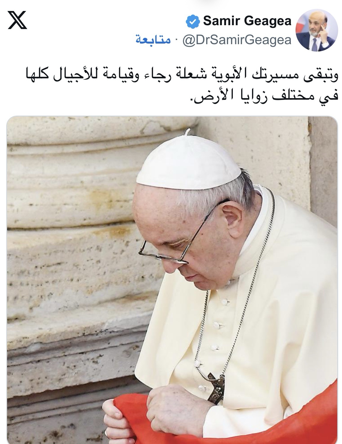 اخبار محليةعلى مدار الساعة *جعجع ناعياً البابا فرنسيس: تبقى مسيرتك الأبوية شعلة رجاء* أبريل 21, 2025 0 97 FacebookTwitterWhatsApp نعى رئيس حزب “القوات اللبنانية سمير جعجع ليوم الإثنين البابا فرنسيس عبر منصة “إكس”، قائلاً: “وتبقى مسيرتك الأبوية شعلة رجاء وقيامة للأجيال كلها في مختلف زوايا الأرض”. وأرفق نعيه البابا فرنسيس بصورة الحبر الأعظم حاملا العلم اللبناني