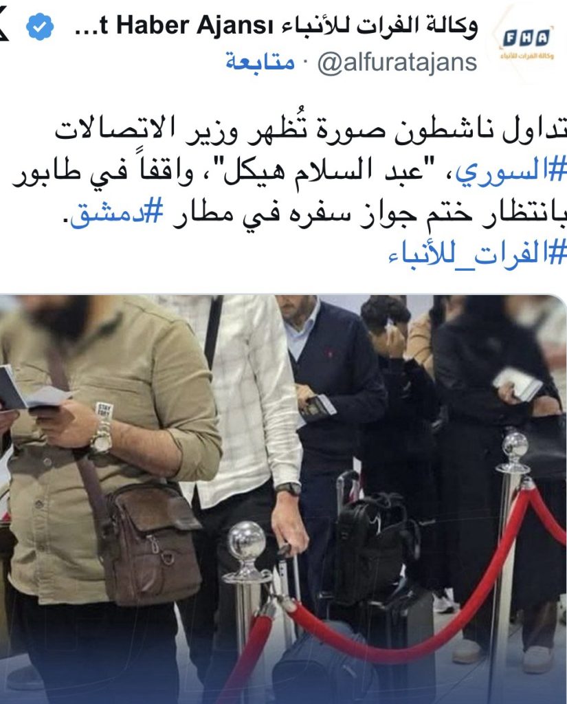 تداول رواد مواقع التواصل الاجتماعي صورة لوزير الاتصالات السوري عبد السلام هيكل في مطار دمشق الدولي، حيث ظهر وسط المواطنين بانتظار إجراءات السفر.