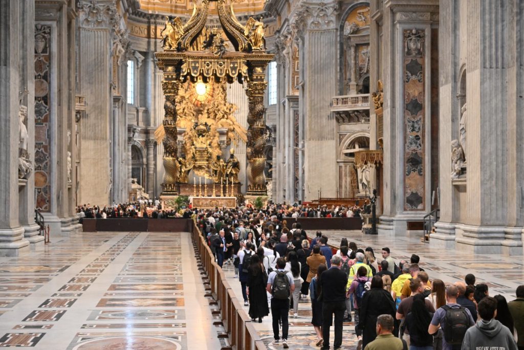 EDITORS NOTE: Graphic content / Mourners and visitors queue to pay their respects to late Pope Francis as he lies in state in a coffin at St Peter’s Basilica in The Vatican, on April 24, 2025. The Vatican on April 24 said some 61,000 people had already paid their respects to Pope Francis, whose body is lying in state in St Peter’s Basilica ahead of his funeral. (Photo by Alberto PIZZOLI / AFP)