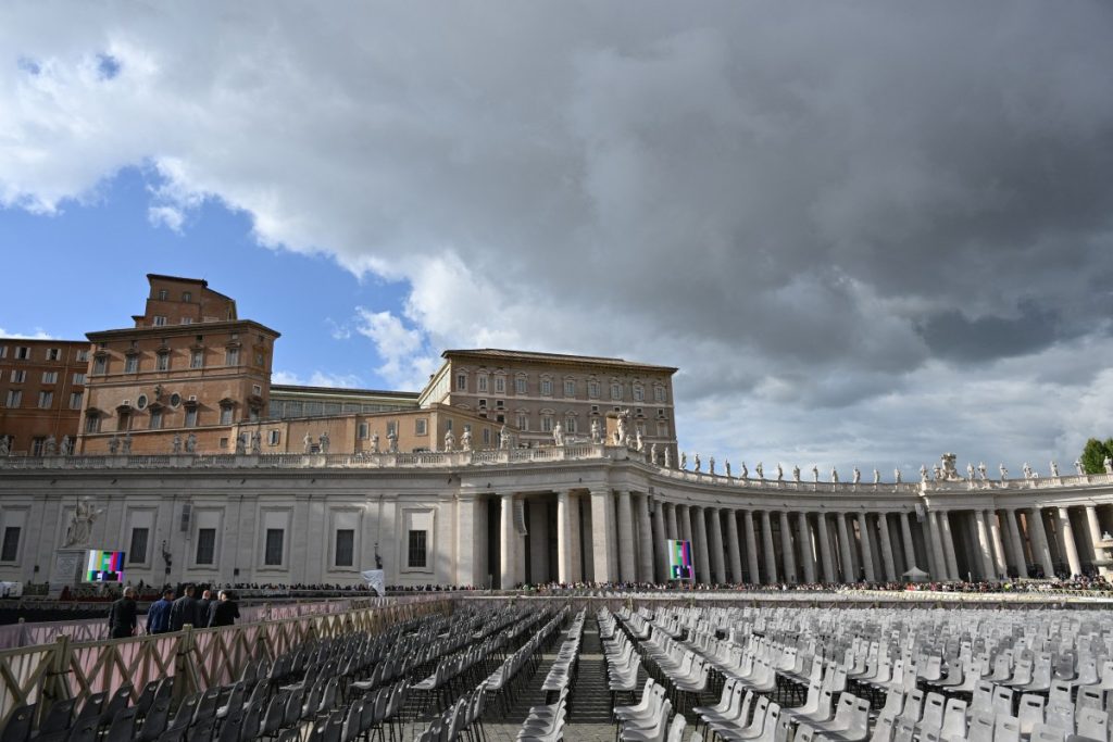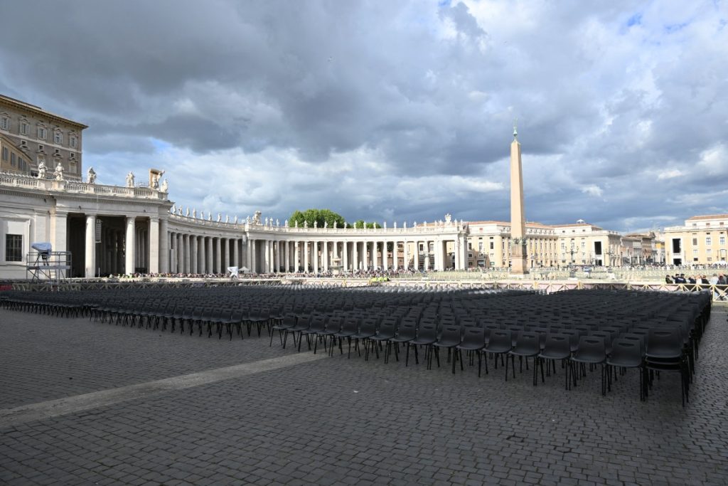 EDITORS NOTE: Graphic content / This photographs shows rows of chairs placed at St Peter’s Square in The Vatican, on April 24, 2025, during preparations ahead of Pope Francis’ funeral on April 26. The Vatican on April 24 said some 61,000 people had already paid their respects to Pope Francis, whose body is lying in state in St Peter’s Basilica ahead of his funeral. (Photo by Alberto PIZZOLI / AFP)