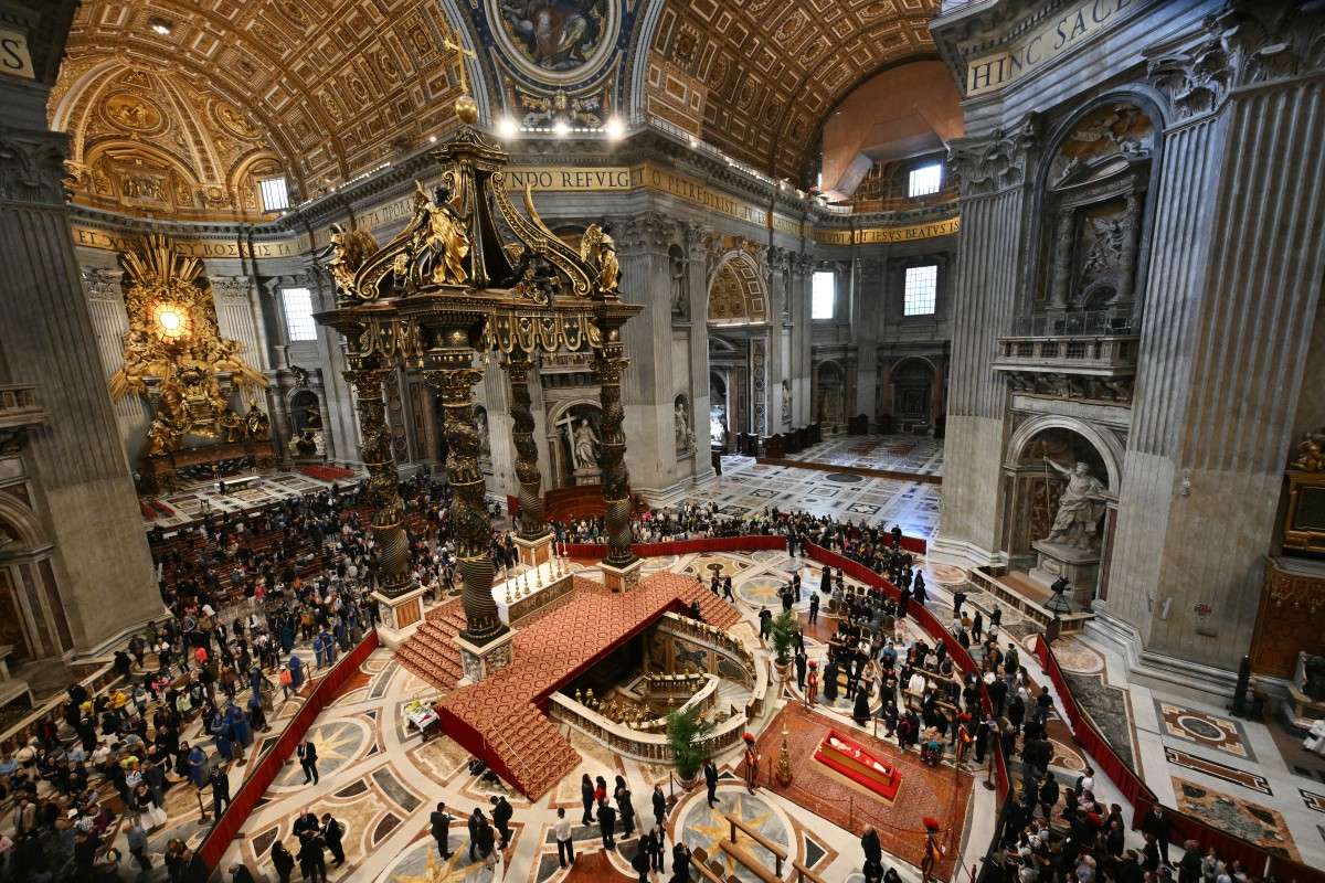EDITORS NOTE: Graphic content / Mourners and visitors pay their respects to late Pope Francis as he lies in state in a coffin at St Peter's Basilica in The Vatican, on April 24, 2025. The Vatican on April 24 said some 61,000 people had already paid their respects to Pope Francis, whose body is lying in state in St Peter's Basilica ahead of his funeral. (Photo by Alberto PIZZOLI / AFP)