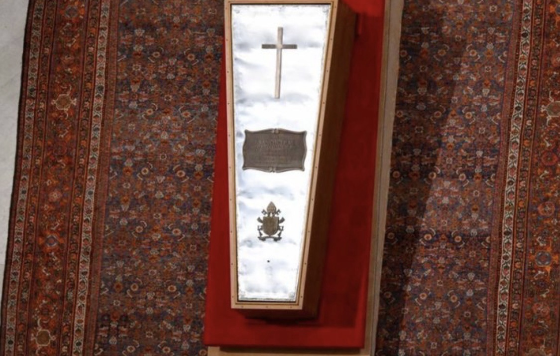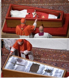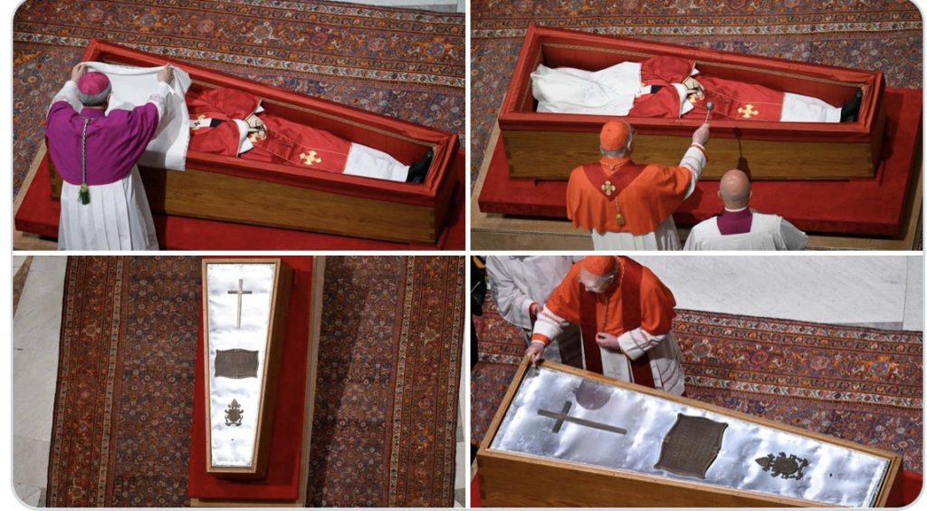 نشر الموقع الرسمي للفاتيكان صوراً من هذه المراسم، مشيراً إلى أن عدد الزوار للصلاة وإلقاء النظرة الأخيرة على نعش البابا، بلغ نحو 250 ألفاً خلال الأيام الثلاثة الماضية. وذكر أن “رئيس الأساقفة دييغو رافيلي فرش قطعة قماش حريرية بيضاء على وجه البابا، بينما رشّ الكاردينال كاميرلينغو فاريل فرانسيس الماء المقدس، ثم وُضع كيس يحتوي على عملات معدنية وميداليات سُكّت خلال حبريته في التابوت مع البابا”. وتابع: “وُضع الغطاء على التابوت الزنكي، إلى جانب صليب فرنسيس وشعاره، ولوحة تحمل اسم البابا ومدة حياته وخدمته البطرسية، بينما رُتلت صلوات، ثم تم ختم التابوت الزنكي بأختام الكاردينال كاميرلينغو وولاية البيت البابوي ومكتب الاحتفالات الليتورجية ومجمع الفاتيكان”.