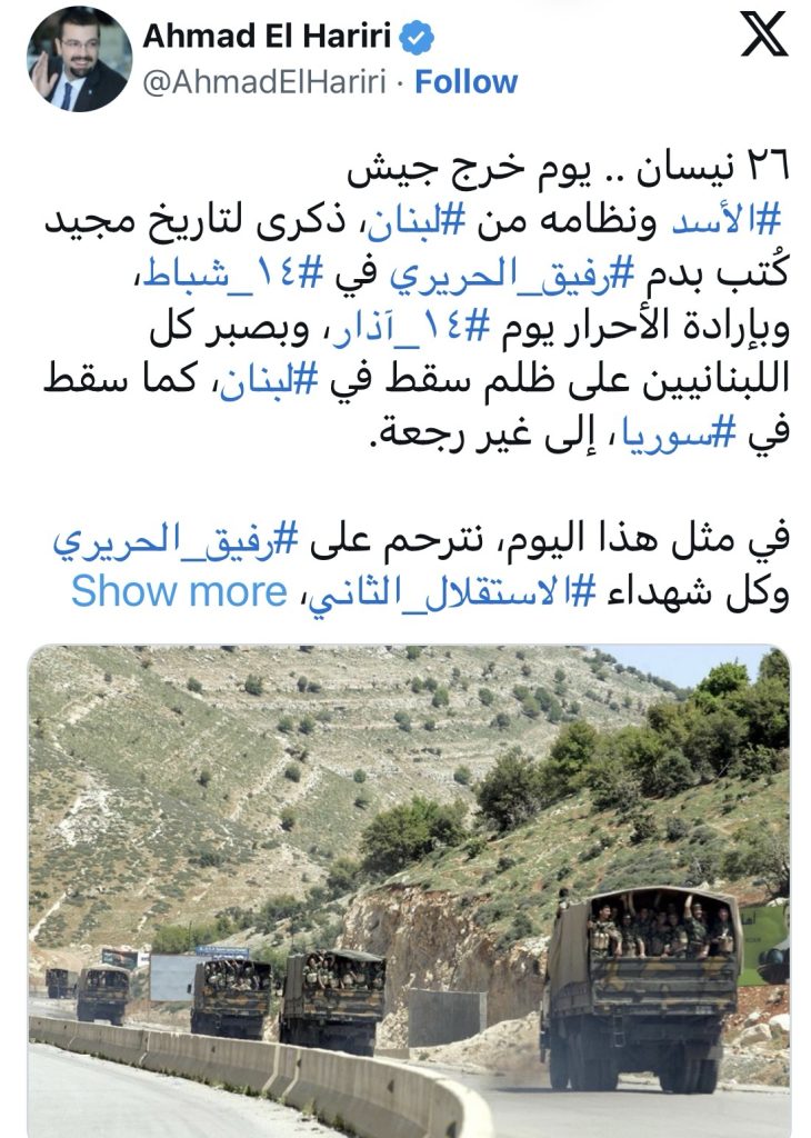 اعتبر الأمين العام ل”تيار المستقبل” أحمد الحريري أن “٢٦ نيسان، يوم خرج جيش #الأسد ونظامه من #لبنان، ذكرى لتاريخ مجيد كُتب بدم #رفيق_الحريري في #١٤_شباط، وبإرادة الأحرار يوم #١٤_آذار، وبصبر كل اللبنانيين على ظلم سقط في #لبنان، كما سقط في #سوريا، إلى غير رجعة”.