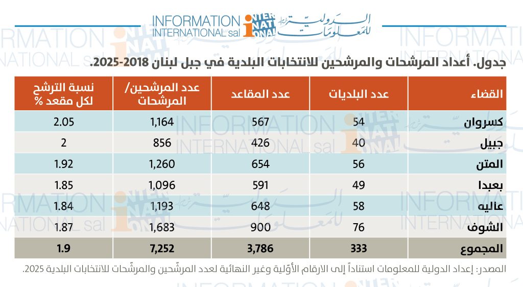 وصل عدد المرشحين والمرشّحات في جبل لبنان إلى 7,252 مرشحاً ومرشّحة في 333 مجلساً بلدياً، مقابل 6,797 مرشحاً ومرشحة في انتخابات العام 2016″.