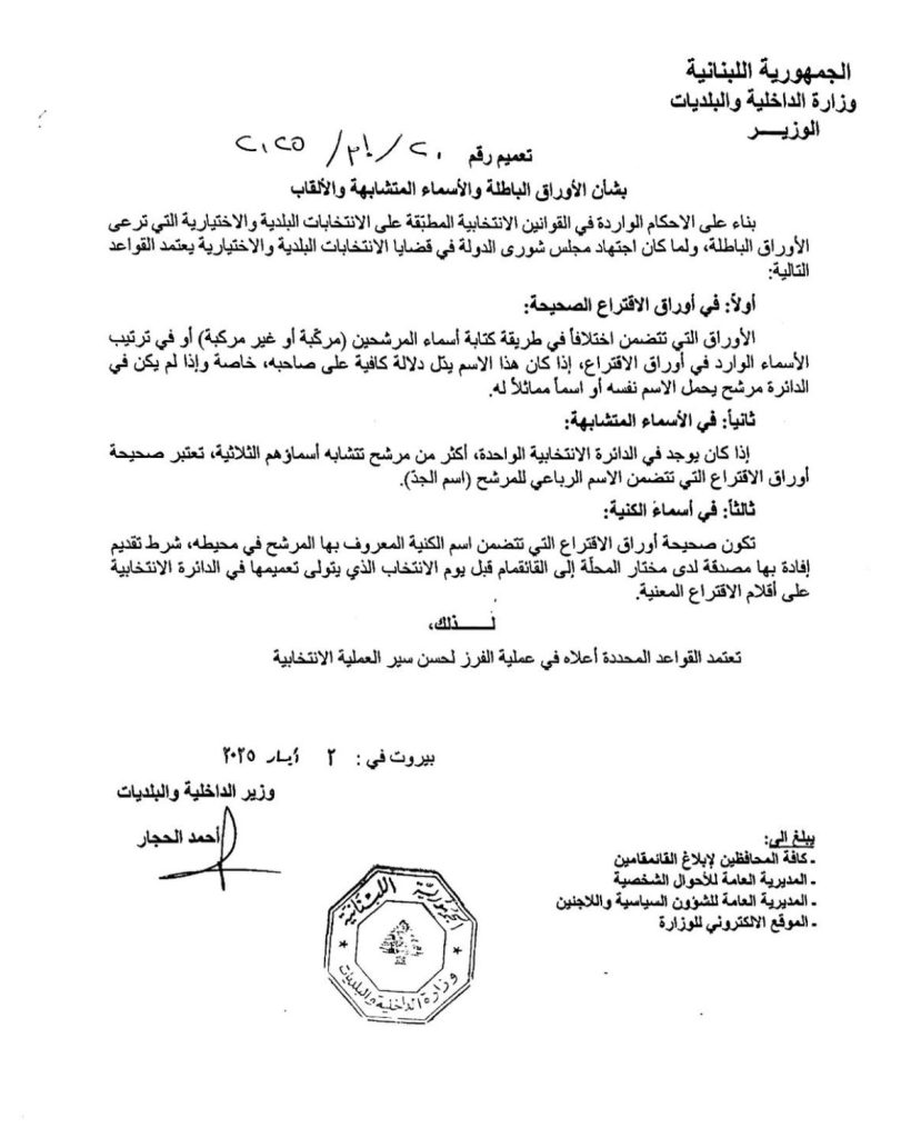 اخبار محليةعلى مدار الساعة تعميم من الحجار بشأن الأوراق الباطلة والأسماء المتشابهة والألقاب مايو 3, 2025 0 113 FacebookTwitterWhatsApp
