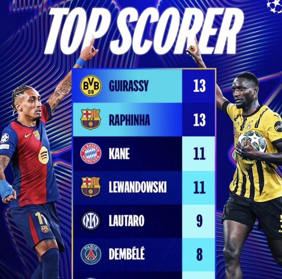 ويعتبر المهاجم الأرجنتيني لاوتارو مارتينيز قائد فريق إنتر ميلان، والفرنسي عثمان ديمبلي جناح فريق باريس سان جيرمان، اللاعبين اللذين لديهما الفرصة في زيادة رصيدهما وإن كانا بعيدين عن الصدارة. إذا يحتل الأرجنتيني المركز الثالث برصيد 9 أهداف، ويليه الفرنسي برصيد 8 أهداف. وفي ما يلي ترتيب أفضل هدافي دوري الأبطال قبل المباراة النهائية: