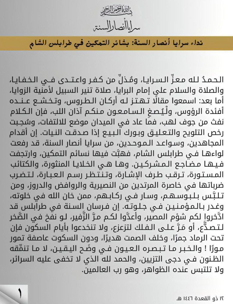بيان منسوب لما يسمى “سرايا أنصار السنة “المتطرفة في سوريا، التابعة لجبهة النصرة تعلن عن تأسيس فرع لها في مدينة طرابلس اللبنانية، وذلك من خلال البيان التالي: الذي تهدد الشيعة والعلويين والدروز في لبنان بـ ” شؤم المصير ومُرّ الزفير “!