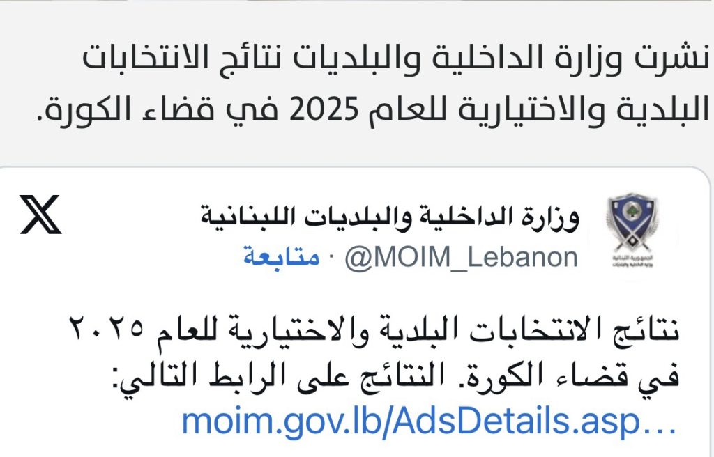 اخبار محليةعلى مدار الساعة *إليكم نتائج الانتخابات البلدية والاختيارية في الكورة* مايو 12, 2025 0 105 FacebookTwitterWhatsApp نتائج الانتخابات البلدية والاختيارية للعام ٢٠٢٥ في قضاء الكورة. النتائج على الرابط التالي:moim.gov.lb/AdsDetails.asp