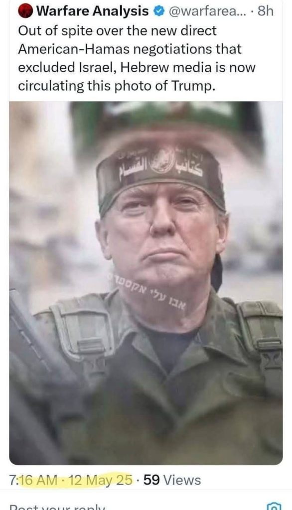 اخبار دوليةعلى مدار الساعة الإعلام العبري ينشر صورة بعد المفاوضات المباشرة بين أمريكا و حما. س مايو 12, 2025 0 118 FacebookTwitterWhatsApp احتجاجًا على المفاوضات المباشرة الجديدة بين أمريكا وحماس والتي استبعدت إسرائيل، تنشر وسائل الإعلام العبرية الآن هذه الصورة لترامب.