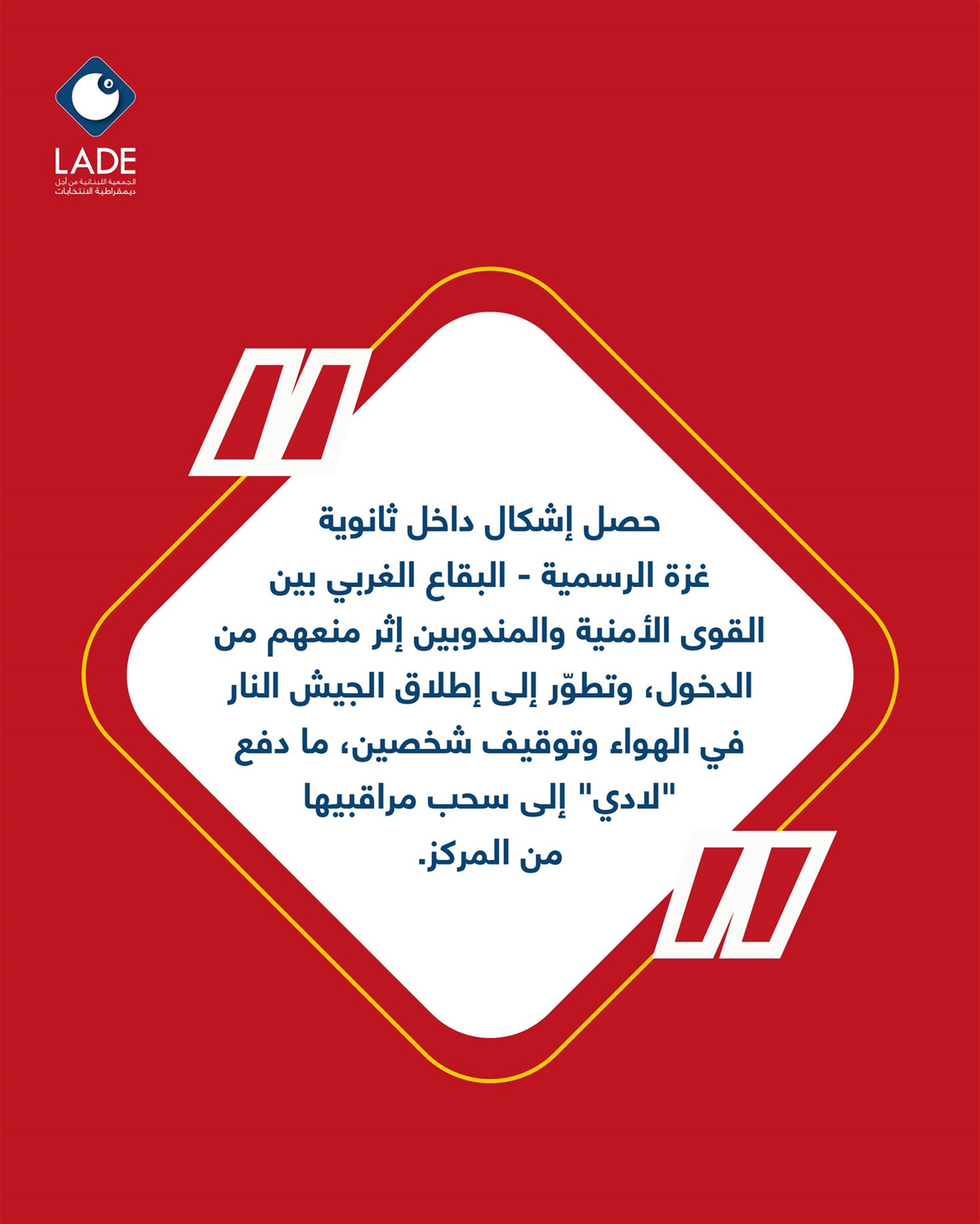 أفادت الجمعية اللبنانية لديمقراطية الانتخابات (LADE) بوقوع إشكال داخل مركز الاقتراع في ثانوية غزة الرسمية – البقاع الغربي، بين القوى الأمنية والمندوبين، على خلفية منع بعضهم من الدخول. وتطور الإشكال إلى إطلاق عناصر من الجيش النار في الهواء، كما جرى توقيف شخصين. وعلى إثر ذلك، قررت الجمعية سحب مراقبيها من المركز.