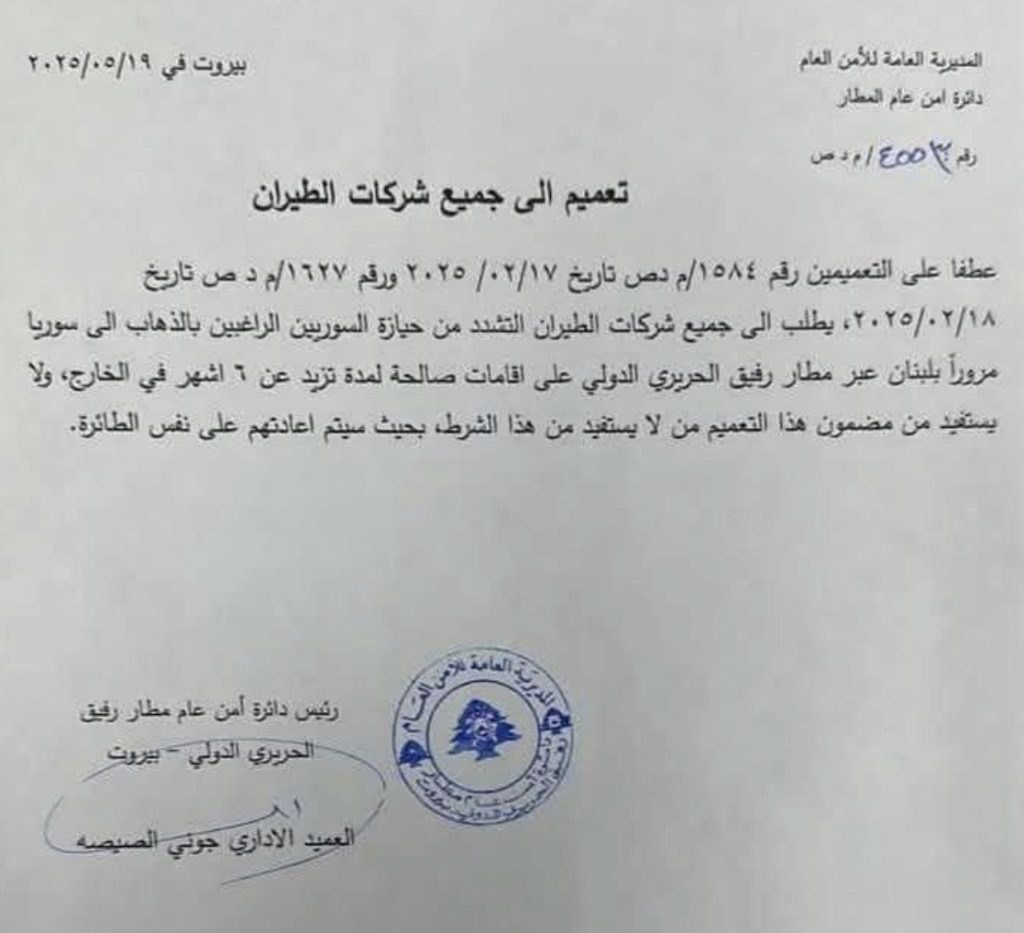 أصدر مطار رفيق الحريري الدولي تعميماً يمنع دخول أي مواطن سوري إلى لبنان عبر المطار، في حال كان متوجهاً إلى سوريا، ما لم يكن بحوزته إقامة صالحة في الخارج تتجاوز مدّتها ستة أشهر.وجاء في التعميم: “سيُعاد المخالفون على متن الطائرة نفسها التي وصلوا بها”.