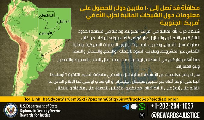 أعلنت الولايات المتحدة الأميركية عن رصد مكافأة مالية ضخمة قيمتها 10 ملايين دولار للحصول على معلومات حول الشبكات المالية لحزب الله في أميركا الجنوبية.